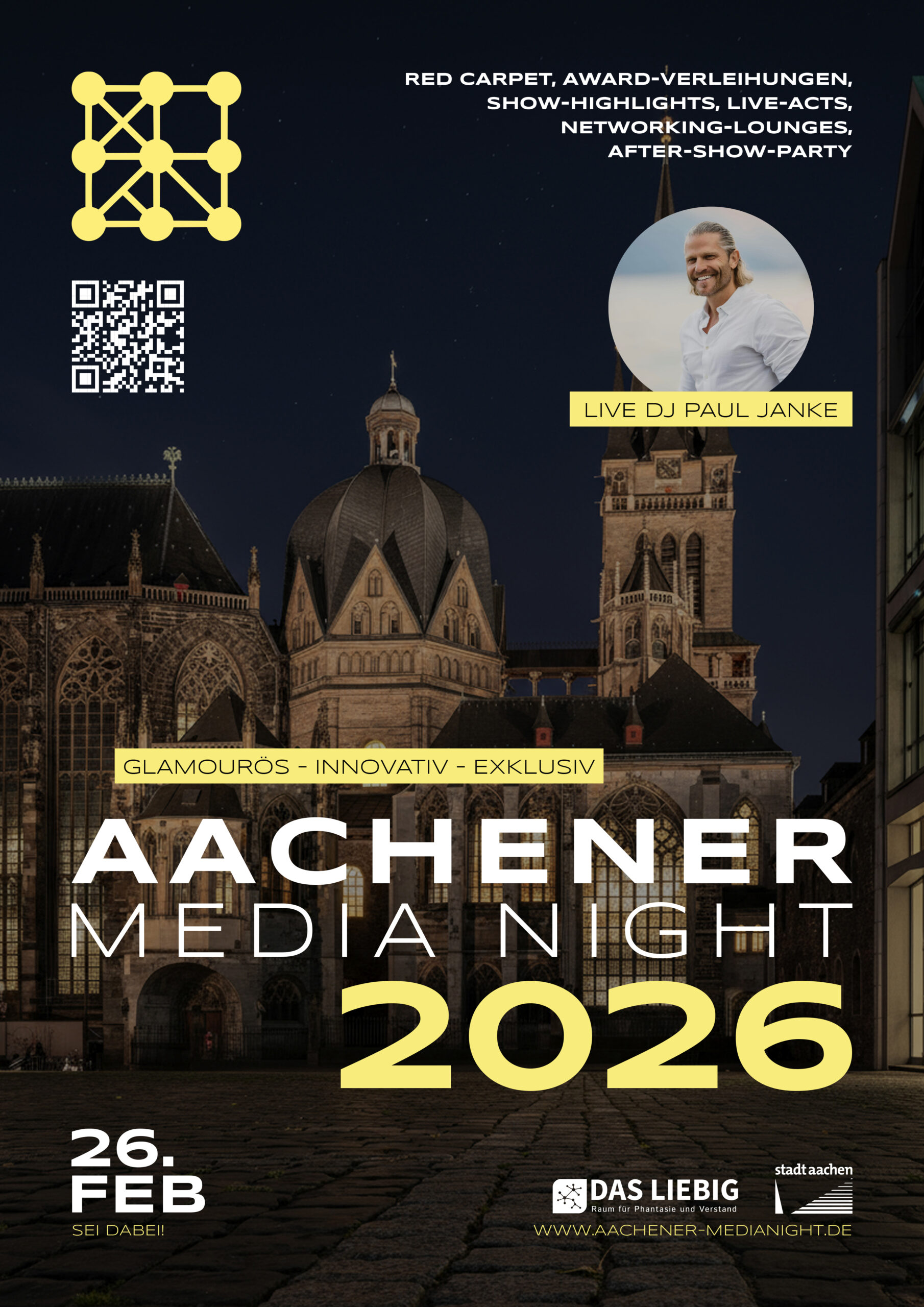 Die Aachener Media Night 2026 ist das Kick-off-Highlight des Jahres für Unternehmer/innen, Medien, Wirtschaft und Gesellschaft in der gesamten Euregio und Wirtschaftsregion Rheinland. Als glanzvoller Jahresauftakt vereint sie Entscheider/innen, Kreative und Medienschaffende über Grenzen hinweg und schafft eine Plattform, auf der Netzwerke wachsen, Ideen entstehen und Visionen Gestalt annehmen.